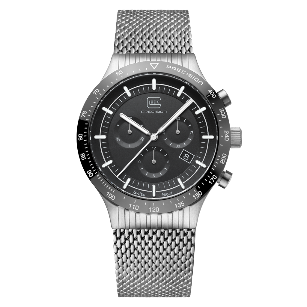 Glock Watch With A Silver Steel Case And Silver Mesh Strap And Extra Black Silicone Strap.Style GW-34-4-24