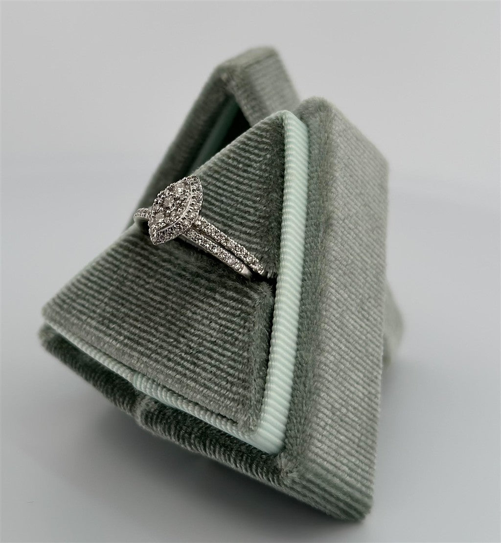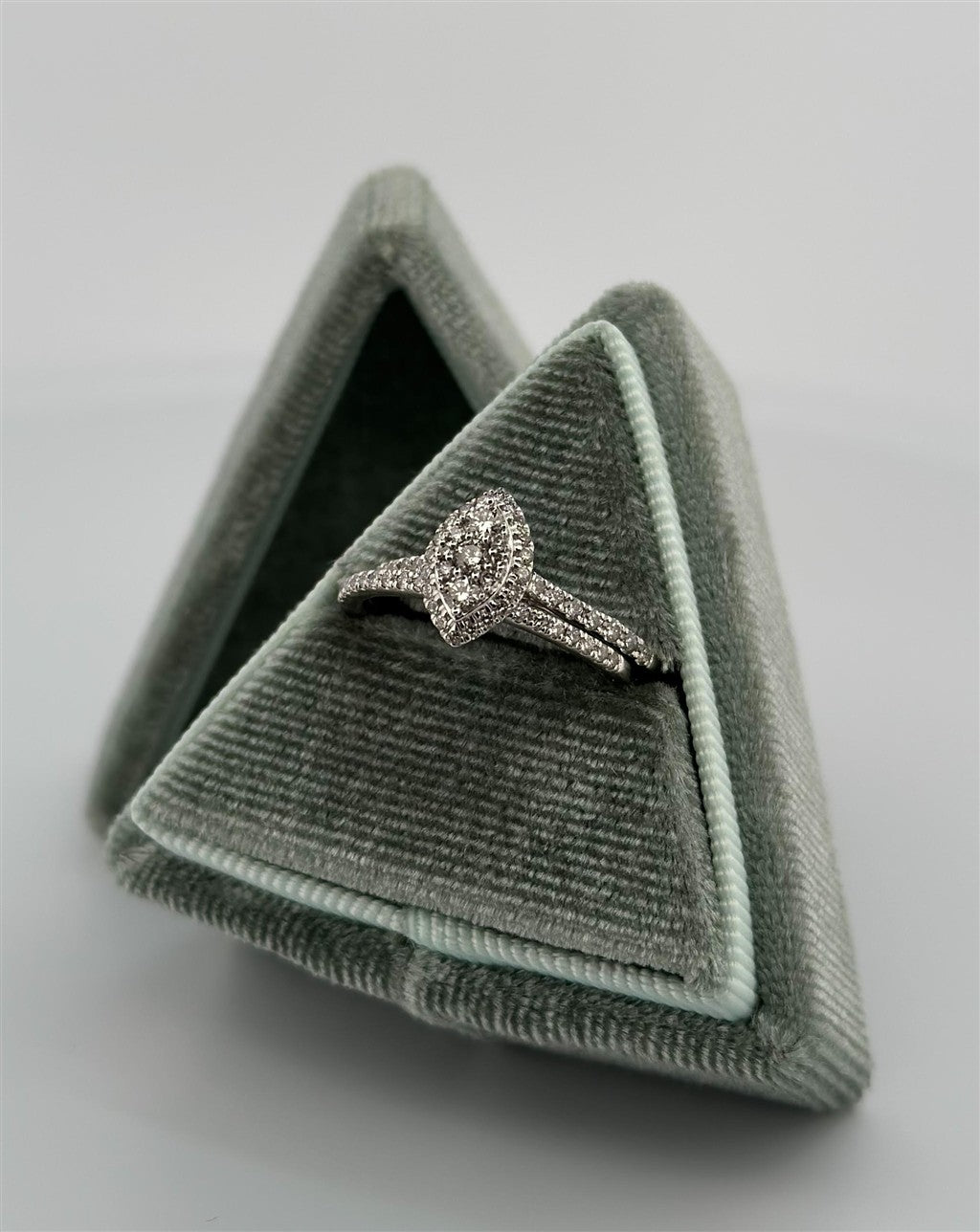 0.63 Carat Diamond Bridal Set. The Engagement Ring Is Set With Round Diamond Cluster In The Shape Of A Marquise With A Diamond Halo Accent With Diamonds Down The Band. It Comes With A Matching .13 Carat Diamond Band. The Rings Are Crafted In 14 Karat White Gold. Style W3243JMQ50W